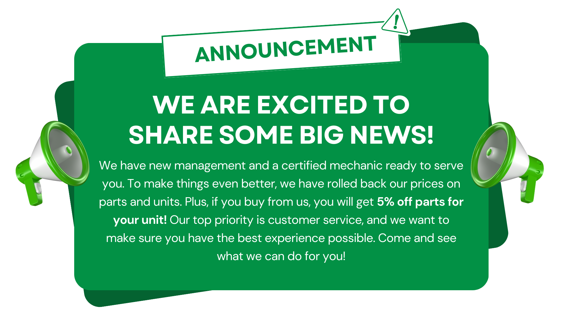 For over 38 years, we have been committed to providing our customers with top-quality service and an extensive selection of premium merchandise. Our inventory features renowned brands such as Dixie Chopper, Cub Cadet, Husqvarna, Dewalt, and Massimo, ensuring you find exactly what you need, whether for residential lawn care or commercial landscaping. Additionally, we offer a wide range of tools, including top-notch chainsaws for tree removal or yard maintenance. But that's not all; our lineup of ATVs, UTVs, Go Karts, and golf carts will meet your needs for work on the farm, thrilling trail rides, or leisurely days at the camp. We pride ourselves not only on the quality of our equipment but also on the financing options available for customers seeking flexible payment solutions beyond immediate out-of-pocket expenses. Moreover, our skilled mechanics are here to provide reliable service, repair, and warranty support without redirecting you elsewhere. We exclusively use OEM parts, ensuring that every repair is crafted with precision for your equipment. Our dedicated sales team goes above and beyond to ensure that your shopping experience is enjoyable and hassle-free. We deeply appreciate your trust in us and look forward to serving all your equipment needs.